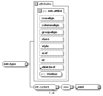 | source | <xsd:complexType name="mtr.type"> <xsd:group ref="mtr.content" minOccurs="1" maxOccurs="unbounded"/> <xsd:attributeGroup ref="mtr.attlist"/> </xsd:complexType> |