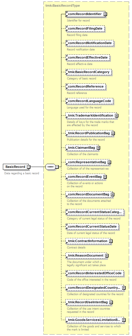 | children | com:RecordIdentifier com:RecordFilingDate com:RecordNotificationDate com:RecordEffectiveDate tmk:BasicRecordCategory com:RecordReference com:RecordLanguageCode tmk:TrademarkIdentification tmk:RecordPublicationBag tmk:ClaimantBag com:RepresentativeBag com:RecordEventBag com:RecordDocumentBag com:RecordCurrentStatusCategory com:RecordCurrentStatusDate tmk:ContractInformation tmk:ReasonDocument com:RecordInterestedOfficeCode com:RecordDesignatedCountryCodeBag tmk:RecordUseIntentBag tmk:GoodsServicesLimitationBag | ||||