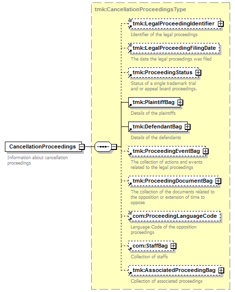 tmk:LegalProceedingIdentifier tmk:LegalProceedingFilingDate tmk:ProceedingStatus tmk:PlaintiffBag tmk:DefendantBag tmk:ProceedingEventBag tmk:ProceedingDocumentBag com:ProceedingLanguageCode com:StaffBag tmk:AssociatedProceedingBag |