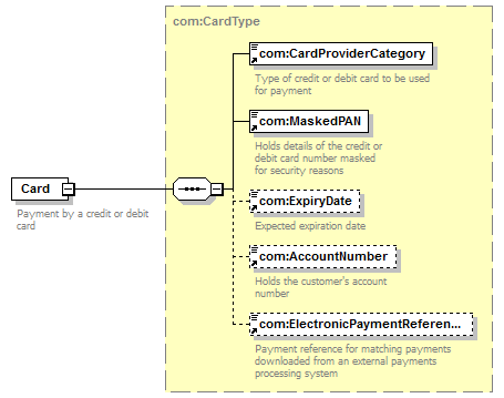 | children | com:CardProviderCategory com:MaskedPAN com:ExpiryDate com:AccountNumber com:ElectronicPaymentReferenceText | ||||