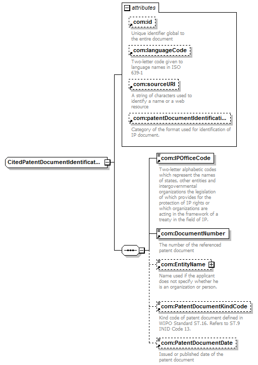 </xsd:sequence> <xsd:attribute ref="com:id"/> <xsd:attribute ref="com:languageCode"/> <xsd:attribute ref="com:sourceURI"/> <xsd:attribute ref="com:patentDocumentIdentificationFormatCategory"/> </xsd:complexType> |