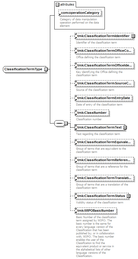 tmk:ClassificationTermIdentifier tmk:ClassificationTermOfficeCode tmk:ClassificationTermOfficeIdentification tmk:ClassificationTermSourceCategory tmk:ClassificationTermEntryDate tmk:ClassNumber tmk:ClassificationTermText tmk:ClassificationTermEquivalentGroup tmk:ClassificationTermReferenceGroup tmk:ClassificationTermTranslationGroup tmk:ClassificationTermStatus tmk:WIPOBasicNumber |