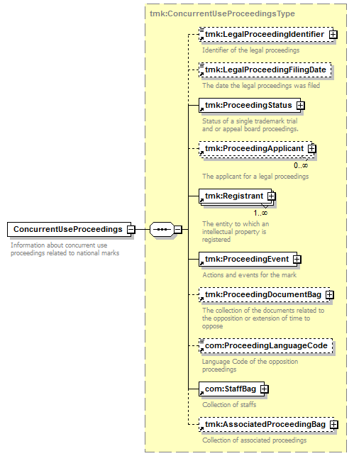 tmk:LegalProceedingIdentifier tmk:LegalProceedingFilingDate tmk:ProceedingStatus tmk:ProceedingApplicant tmk:Registrant tmk:ProceedingEvent tmk:ProceedingDocumentBag com:ProceedingLanguageCode com:StaffBag tmk:AssociatedProceedingBag |