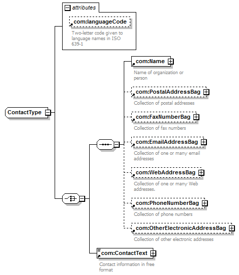 <xsd:sequence> <xsd:element ref="com:Name"/> <xsd:element ref="com:PostalAddressBag" minOccurs="0"/> <xsd:element ref="com:FaxNumberBag" minOccurs="0"/> <xsd:element ref="com:EmailAddressBag" minOccurs="0"/> <xsd:element ref="com:WebAddressBag" minOccurs="0"/> <xsd:element ref="com:PhoneNumberBag" minOccurs="0"/> <xsd:element ref="com:OtherElectronicAddressBag" minOccurs="0"/> </xsd:sequence> |