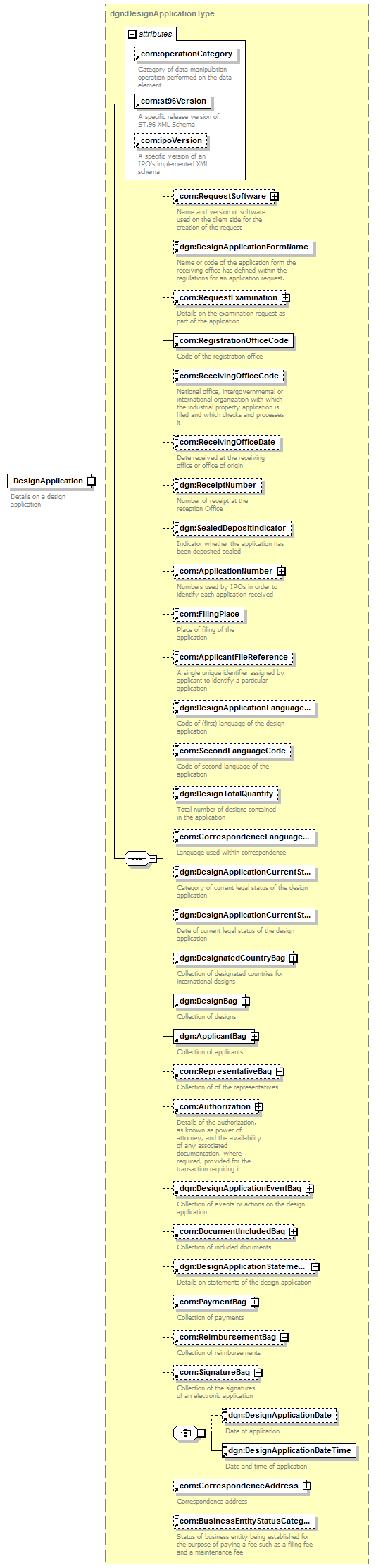 com:RequestSoftware dgn:DesignApplicationFormName com:RequestExamination com:RegistrationOfficeCode com:ReceivingOfficeCode com:ReceivingOfficeDate dgn:ReceiptNumber dgn:SealedDepositIndicator com:ApplicationNumber com:FilingPlace com:ApplicantFileReference dgn:DesignApplicationLanguageCode com:SecondLanguageCode dgn:DesignTotalQuantity com:CorrespondenceLanguageCode dgn:DesignApplicationCurrentStatusCategory dgn:DesignApplicationCurrentStatusDate dgn:DesignatedCountryBag dgn:DesignBag dgn:ApplicantBag com:RepresentativeBag com:Authorization dgn:DesignApplicationEventBag com:DocumentIncludedBag dgn:DesignApplicationStatementBag com:PaymentBag com:ReimbursementBag com:SignatureBag dgn:DesignApplicationDate dgn:DesignApplicationDateTime com:CorrespondenceAddress com:BusinessEntityStatusCategory |