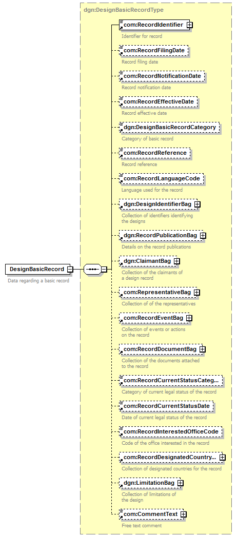 com:RecordIdentifier com:RecordFilingDate com:RecordNotificationDate com:RecordEffectiveDate dgn:DesignBasicRecordCategory com:RecordReference com:RecordLanguageCode dgn:DesignIdentifierBag dgn:RecordPublicationBag dgn:ClaimantBag com:RepresentativeBag com:RecordEventBag com:RecordDocumentBag com:RecordCurrentStatusCategory com:RecordCurrentStatusDate com:RecordInterestedOfficeCode com:RecordDesignatedCountryCodeBag dgn:LimitationBag com:CommentText |