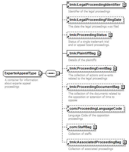 tmk:LegalProceedingIdentifier tmk:LegalProceedingFilingDate tmk:ProceedingStatus tmk:PlaintiffBag tmk:ProceedingEventBag tmk:ProceedingDocumentBag com:ProceedingLanguageCode com:StaffBag tmk:AssociatedProceedingBag |