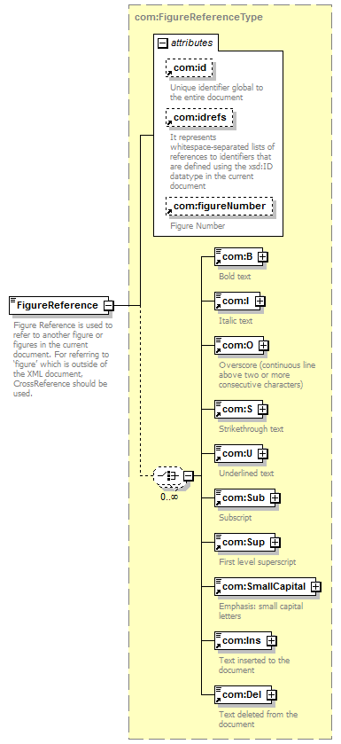 <xsd:documentation> Figure Reference is used to refer to another figure or figures in the current document. For referring to ‘figure’ which is outside of the XML document, CrossReference should be used. </xsd:documentation> |