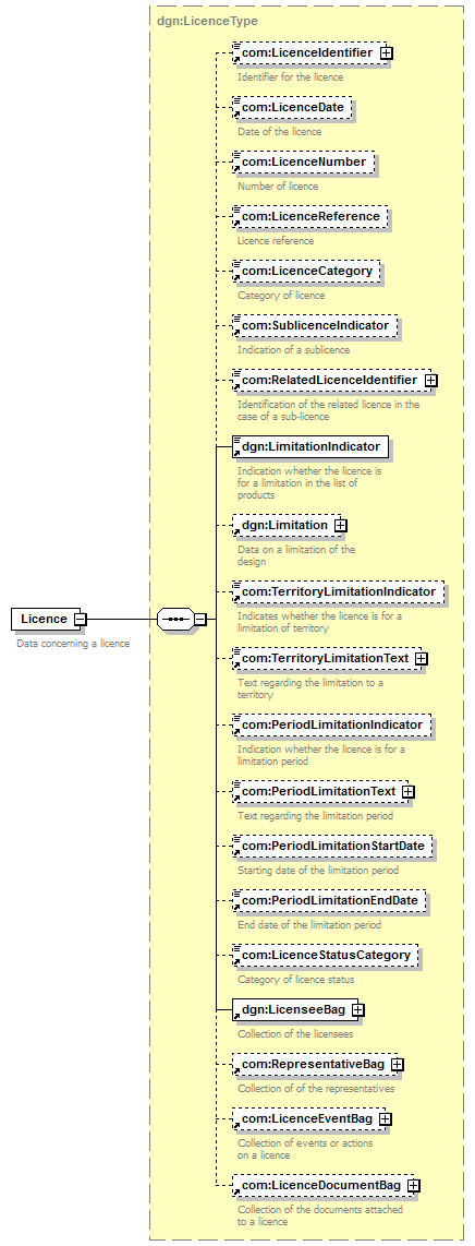 | children | com:LicenceIdentifier com:LicenceDate com:LicenceNumber com:LicenceReference com:LicenceCategory com:SublicenceIndicator com:RelatedLicenceIdentifier dgn:LimitationIndicator dgn:Limitation com:TerritoryLimitationIndicator com:TerritoryLimitationText com:PeriodLimitationIndicator com:PeriodLimitationText com:PeriodLimitationStartDate com:PeriodLimitationEndDate com:LicenceStatusCategory dgn:LicenseeBag com:RepresentativeBag com:LicenceEventBag com:LicenceDocumentBag | ||||
