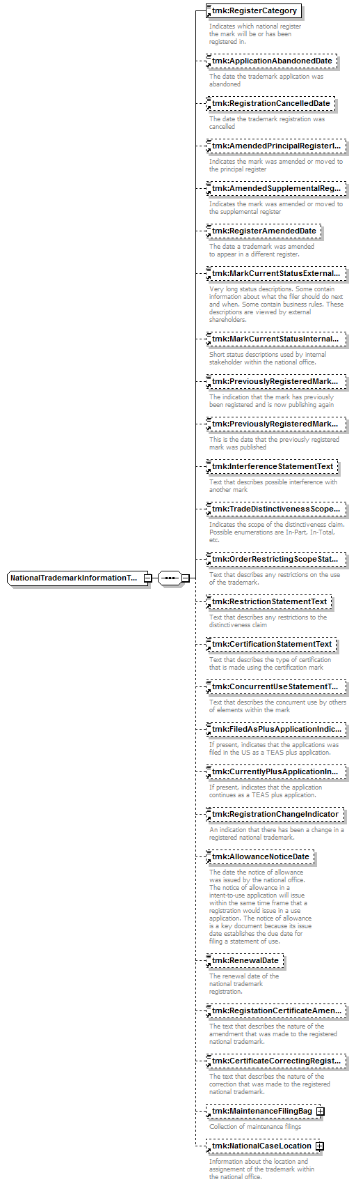 tmk:RegisterCategory tmk:ApplicationAbandonedDate tmk:RegistrationCancelledDate tmk:AmendedPrincipalRegisterIndicator tmk:AmendedSupplementalRegisterIndicator tmk:RegisterAmendedDate tmk:MarkCurrentStatusExternalDescriptionText tmk:MarkCurrentStatusInternalDescriptionText tmk:PreviouslyRegisteredMarkPublicationIndicator tmk:PreviouslyRegisteredMarkPublishedDate tmk:InterferenceStatementText tmk:TradeDistinctivenessScopeText tmk:OrderRestrictingScopeStatementText tmk:RestrictionStatementText tmk:CertificationStatementText tmk:ConcurrentUseStatementText tmk:FiledAsPlusApplicationIndicator tmk:CurrentlyPlusApplicationIndicator tmk:RegistrationChangeIndicator tmk:AllowanceNoticeDate tmk:RenewalDate tmk:RegistationCertificateAmendmentText tmk:CertificateCorrectingRegistrationText tmk:MaintenanceFilingBag tmk:NationalCaseLocation |