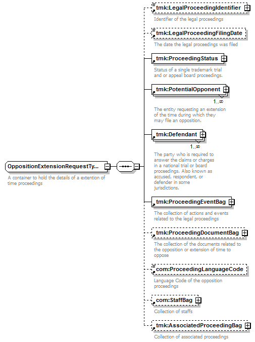 tmk:LegalProceedingIdentifier tmk:LegalProceedingFilingDate tmk:ProceedingStatus tmk:PotentialOpponent tmk:Defendant tmk:ProceedingEventBag tmk:ProceedingDocumentBag com:ProceedingLanguageCode com:StaffBag tmk:AssociatedProceedingBag |