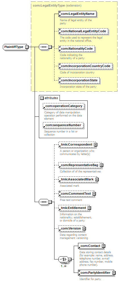 com:LegalEntityName com:NationalLegalEntityCode com:NationalityCode com:IncorporationCountryCode com:IncorporationState tmk:Correspondent com:RepresentativeBag tmk:AssociatedMark com:CommentText tmk:Entitlement com:Version com:Contact com:PartyIdentifier |