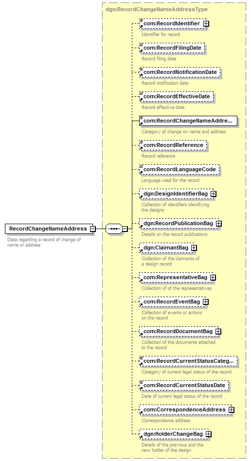 com:RecordIdentifier com:RecordFilingDate com:RecordNotificationDate com:RecordEffectiveDate com:RecordChangeNameAddressCategory com:RecordReference com:RecordLanguageCode dgn:DesignIdentifierBag dgn:RecordPublicationBag dgn:ClaimantBag com:RepresentativeBag com:RecordEventBag com:RecordDocumentBag com:RecordCurrentStatusCategory com:RecordCurrentStatusDate com:CorrespondenceAddress dgn:HolderChangeBag |