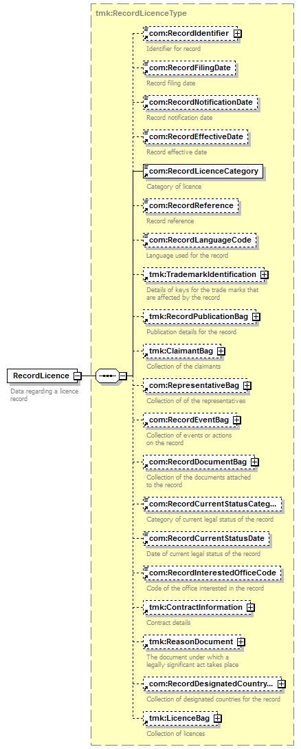 | children | com:RecordIdentifier com:RecordFilingDate com:RecordNotificationDate com:RecordEffectiveDate com:RecordLicenceCategory com:RecordReference com:RecordLanguageCode tmk:TrademarkIdentification tmk:RecordPublicationBag tmk:ClaimantBag com:RepresentativeBag com:RecordEventBag com:RecordDocumentBag com:RecordCurrentStatusCategory com:RecordCurrentStatusDate com:RecordInterestedOfficeCode tmk:ContractInformation tmk:ReasonDocument com:RecordDesignatedCountryCodeBag tmk:LicenceBag | ||||