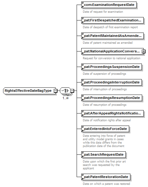 com:ExaminationRequestDate pat:FirstDespatchedExaminationReportDate pat:PatentMaintainedAsAmendedDate pat:NationalApplicationConversionRequest pat:ProceedingsSuspensionDate pat:ProceedingsInterruptionDate pat:ProceedingsResumptionDate pat:AfterAppealRightsNotificationDate pat:EnteredIntoForceDate pat:SearchRequestDate pat:PatentRestorationDate |
