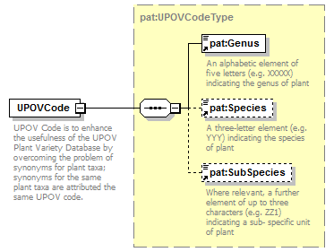 <xsd:documentation> UPOV Code is to enhance the usefulness of the UPOV Plant Variety Database by overcoming the problem of synonyms for plant taxa; synonyms for the same plant taxa are attributed the same UPOV code. </xsd:documentation> |
