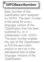 <xsd:documentation> Basic Number of the classification term assigned by WIPO. The basic number is the same for every language version of the Classification that has been published by, or in collaboration with, WIPO. The basic number enables the user of the Classification to find the equivalent product or service in the alphabetical lists of other language versions of the Classification. </xsd:documentation> |