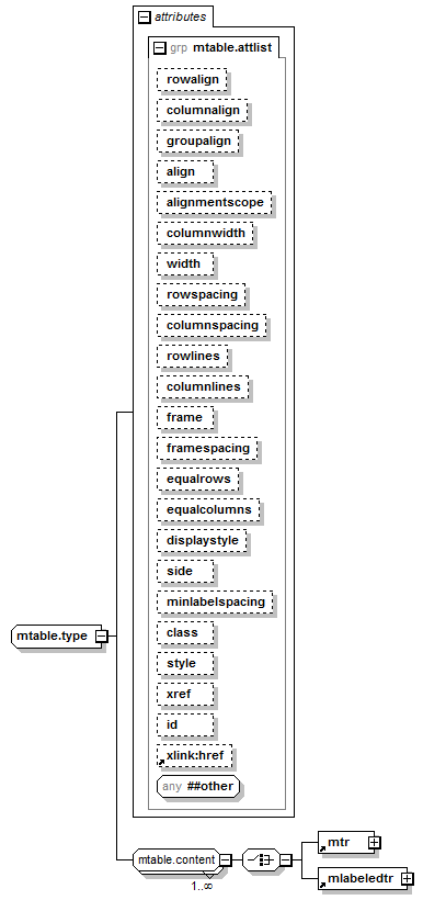| source | <xsd:complexType name="mtable.type"> <xsd:group ref="mtable.content" minOccurs="1" maxOccurs="unbounded"/> <xsd:attributeGroup ref="mtable.attlist"/> </xsd:complexType> |