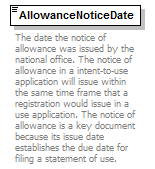 <xsd:documentation> The date the notice of allowance was issued by the national office. The notice of allowance in a intent-to-use application will issue within the same time frame that a registration would issue in a use application. The notice of allowance is a key document because its issue date establishes the due date for filing a statement of use. </xsd:documentation> |
