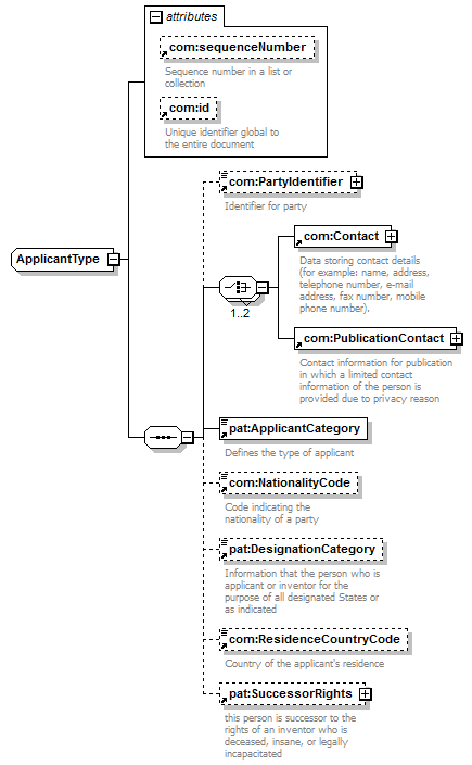 com:PartyIdentifier com:Contact com:PublicationContact pat:ApplicantCategory com:NationalityCode pat:DesignationCategory com:ResidenceCountryCode pat:SuccessorRights |