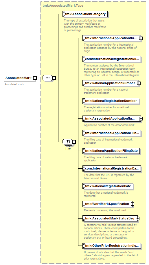 | children | tmk:AssociationCategory tmk:InternationalApplicationNumber com:InternationalRegistrationNumber tmk:NationalApplicationNumber tmk:NationalRegistrationNumber tmk:AssociatedApplicationNumber tmk:InternationalApplicationFilingDate tmk:NationalApplicationFilingDate com:InternationalRegistrationDate tmk:NationalRegistrationDate tmk:WordMarkSpecification tmk:AssociatedMarkStatusBag tmk:OtherPriorRegistrationIndicator | ||||