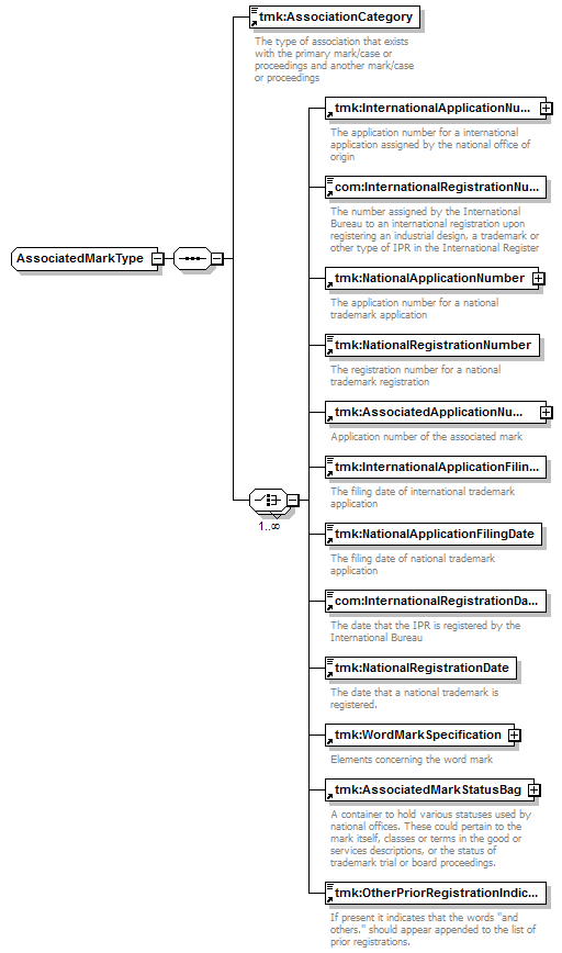 tmk:AssociationCategory tmk:InternationalApplicationNumber com:InternationalRegistrationNumber tmk:NationalApplicationNumber tmk:NationalRegistrationNumber tmk:AssociatedApplicationNumber tmk:InternationalApplicationFilingDate tmk:NationalApplicationFilingDate com:InternationalRegistrationDate tmk:NationalRegistrationDate tmk:WordMarkSpecification tmk:AssociatedMarkStatusBag tmk:OtherPriorRegistrationIndicator |