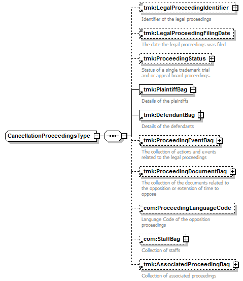 tmk:LegalProceedingIdentifier tmk:LegalProceedingFilingDate tmk:ProceedingStatus tmk:PlaintiffBag tmk:DefendantBag tmk:ProceedingEventBag tmk:ProceedingDocumentBag com:ProceedingLanguageCode com:StaffBag tmk:AssociatedProceedingBag |