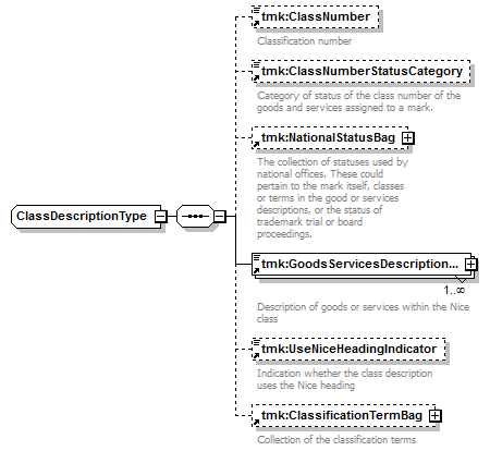tmk:ClassNumber tmk:ClassNumberStatusCategory tmk:NationalStatusBag tmk:GoodsServicesDescriptionText tmk:UseNiceHeadingIndicator tmk:ClassificationTermBag |