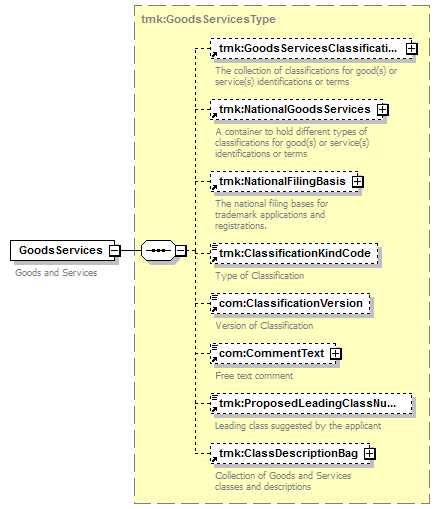 | children | tmk:GoodsServicesClassificationBag tmk:NationalGoodsServices tmk:NationalFilingBasis tmk:ClassificationKindCode com:ClassificationVersion com:CommentText tmk:ProposedLeadingClassNumber tmk:ClassDescriptionBag | ||||