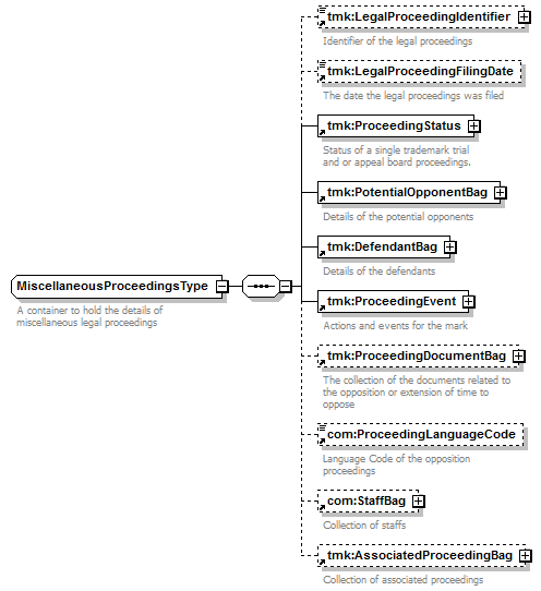 tmk:LegalProceedingIdentifier tmk:LegalProceedingFilingDate tmk:ProceedingStatus tmk:PotentialOpponentBag tmk:DefendantBag tmk:ProceedingEvent tmk:ProceedingDocumentBag com:ProceedingLanguageCode com:StaffBag tmk:AssociatedProceedingBag |