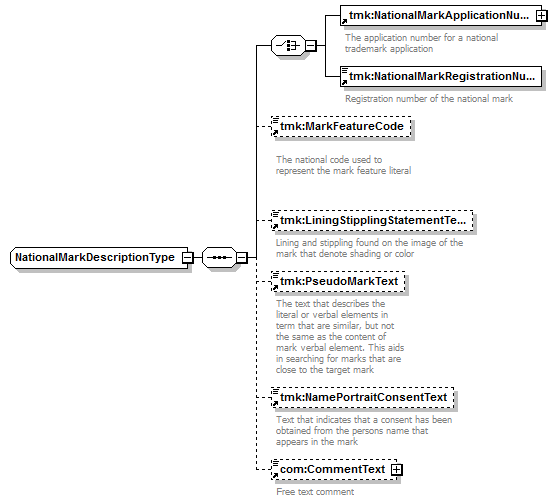 tmk:NationalMarkApplicationNumber tmk:NationalMarkRegistrationNumber tmk:MarkFeatureCode tmk:LiningStipplingStatementText tmk:PseudoMarkText tmk:NamePortraitConsentText com:CommentText |