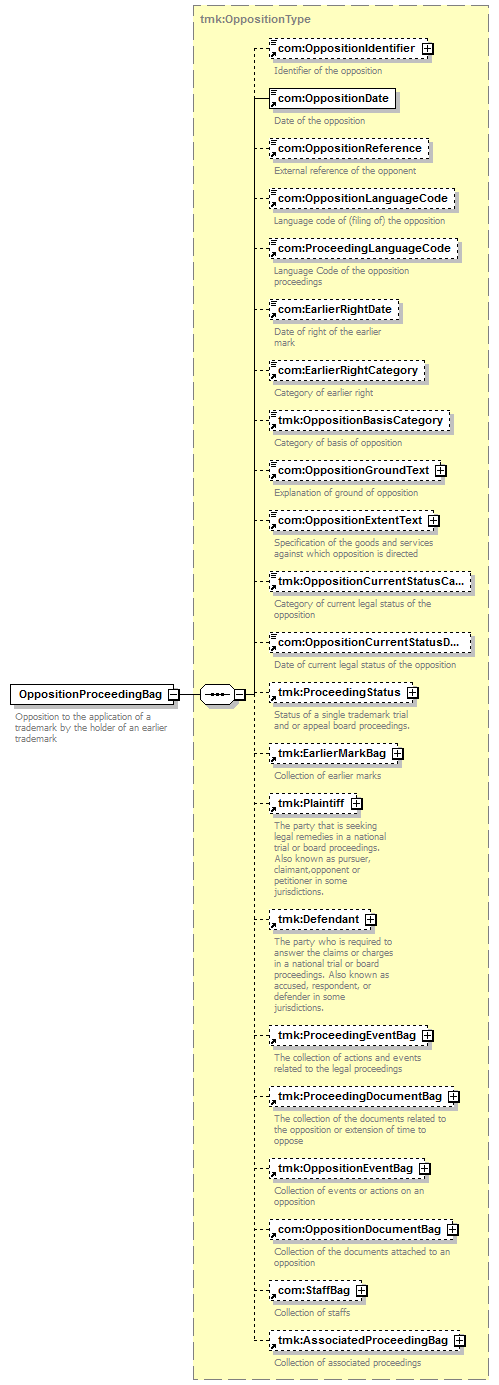| children | com:OppositionIdentifier com:OppositionDate com:OppositionReference com:OppositionLanguageCode com:ProceedingLanguageCode com:EarlierRightDate com:EarlierRightCategory tmk:OppositionBasisCategory com:OppositionGroundText com:OppositionExtentText tmk:OppositionCurrentStatusCategory com:OppositionCurrentStatusDate tmk:ProceedingStatus tmk:EarlierMarkBag tmk:Plaintiff tmk:Defendant tmk:ProceedingEventBag tmk:ProceedingDocumentBag tmk:OppositionEventBag com:OppositionDocumentBag com:StaffBag tmk:AssociatedProceedingBag | ||||