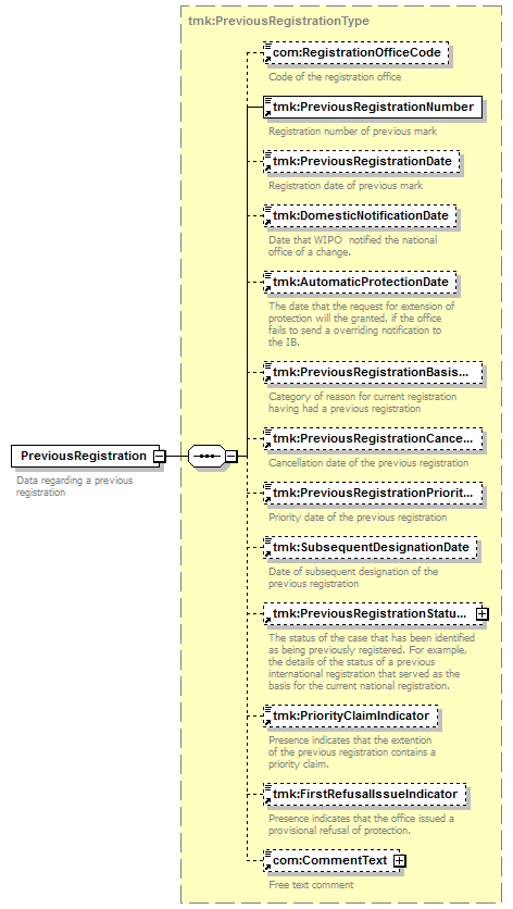 | children | com:RegistrationOfficeCode tmk:PreviousRegistrationNumber tmk:PreviousRegistrationDate tmk:DomesticNotificationDate tmk:AutomaticProtectionDate tmk:PreviousRegistrationBasisCategory tmk:PreviousRegistrationCancellationDate tmk:PreviousRegistrationPriorityDate tmk:SubsequentDesignationDate tmk:PreviousRegistrationStatusBag tmk:PriorityClaimIndicator tmk:FirstRefusalIssueIndicator com:CommentText | ||||