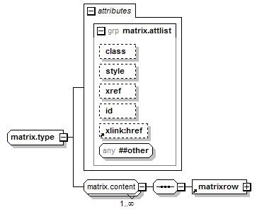 | source | <xsd:complexType name="matrix.type"> <xsd:group ref="matrix.content" minOccurs="1" maxOccurs="unbounded"/> <xsd:attributeGroup ref="matrix.attlist"/> </xsd:complexType> |