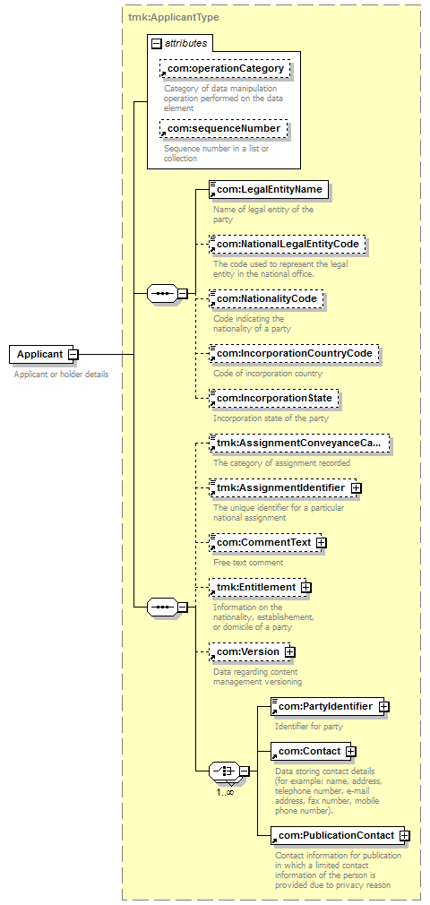 com:LegalEntityName com:NationalLegalEntityCode com:NationalityCode com:IncorporationCountryCode com:IncorporationState tmk:AssignmentConveyanceCategory tmk:AssignmentIdentifier com:CommentText tmk:Entitlement com:Version com:PartyIdentifier com:Contact com:PublicationContact |