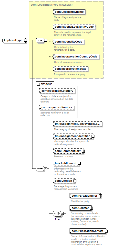 com:LegalEntityName com:NationalLegalEntityCode com:NationalityCode com:IncorporationCountryCode com:IncorporationState tmk:AssignmentConveyanceCategory tmk:AssignmentIdentifier com:CommentText tmk:Entitlement com:Version com:PartyIdentifier com:Contact com:PublicationContact |