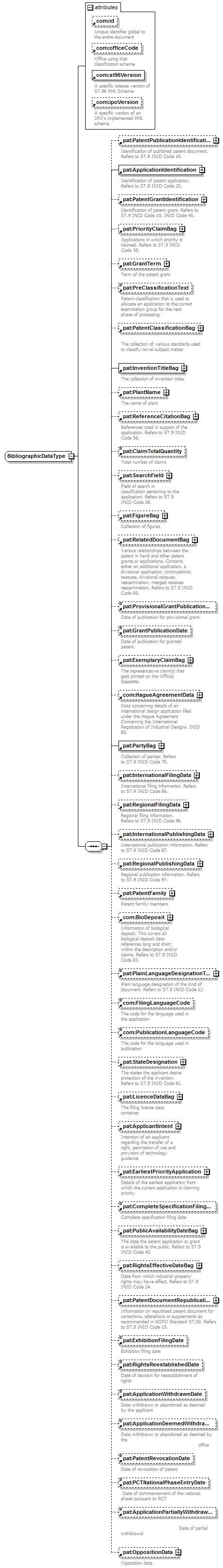 pat:PatentPublicationIdentification pat:ApplicationIdentification pat:PatentGrantIdentification pat:PriorityClaimBag pat:GrantTerm pat:PreClassificationText pat:PatentClassificationBag pat:InventionTitleBag pat:PlantName pat:ReferenceCitationBag pat:ClaimTotalQuantity pat:SearchField pat:FigureBag pat:RelatedDocumentBag pat:ProvisionalGrantPublicationDate pat:GrantPublicationDate pat:ExemplaryClaimBag com:HagueAgreementData pat:PartyBag pat:InternationalFilingData pat:RegionalFilingData pat:InternationalPublishingData pat:RegionalPublishingData pat:PatentFamily com:BioDeposit pat:PlainLanguageDesignationText com:FilingLanguageCode com:PublicationLanguageCode pat:StateDesignation pat:LicenceDataBag pat:ApplicantIntent pat:EarliestPriorityApplication pat:CompleteSpecificationFilingDate pat:PublicAvailabilityDateBag pat:RightsEffectiveDateBag pat:PatentDocumentRepublication pat:ExhibitionFilingDate pat:RightsReestablishedDate pat:ApplicationWithdrawnDate pat:ApplicationDeemedWithdrawnDate pat:PatentRevocationDate pat:PCTNationalPhaseEntryDate pat:ApplicationPartiallyWithdrawnDate pat:OppositionData |