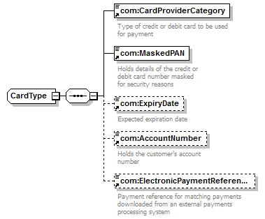 | children | com:CardProviderCategory com:MaskedPAN com:ExpiryDate com:AccountNumber com:ElectronicPaymentReferenceText | ||||||||||