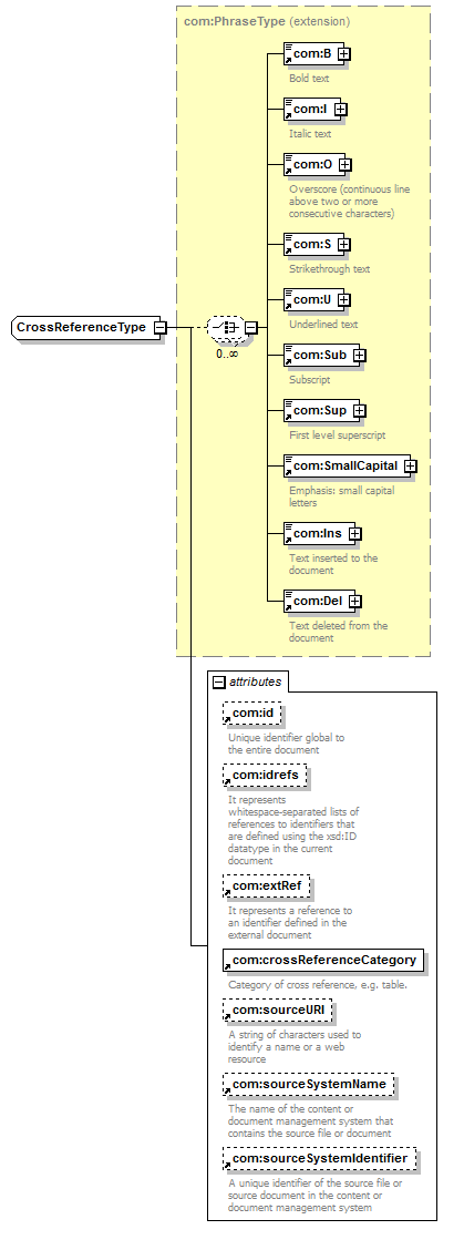 <xsd:extension base="com:PhraseType"> <xsd:attribute ref="com:id"/> <xsd:attribute ref="com:idrefs"/> <xsd:attribute ref="com:extRef"/> <xsd:attribute ref="com:crossReferenceCategory" use="required"/> <xsd:attribute ref="com:sourceURI"/> <xsd:attribute ref="com:sourceSystemName"/> <xsd:attribute ref="com:sourceSystemIdentifier"/> </xsd:extension> |