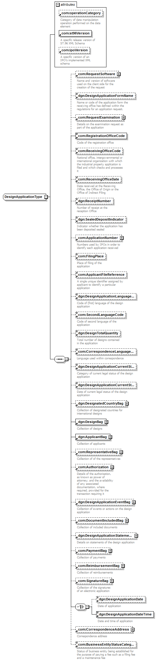 com:RequestSoftware dgn:DesignApplicationFormName com:RequestExamination com:RegistrationOfficeCode com:ReceivingOfficeCode com:ReceivingOfficeDate dgn:ReceiptNumber dgn:SealedDepositIndicator com:ApplicationNumber com:FilingPlace com:ApplicantFileReference dgn:DesignApplicationLanguageCode com:SecondLanguageCode dgn:DesignTotalQuantity com:CorrespondenceLanguageCode dgn:DesignApplicationCurrentStatusCategory dgn:DesignApplicationCurrentStatusDate dgn:DesignatedCountryBag dgn:DesignBag dgn:ApplicantBag com:RepresentativeBag com:Authorization dgn:DesignApplicationEventBag com:DocumentIncludedBag dgn:DesignApplicationStatementBag com:PaymentBag com:ReimbursementBag com:SignatureBag dgn:DesignApplicationDate dgn:DesignApplicationDateTime com:CorrespondenceAddress com:BusinessEntityStatusCategory |