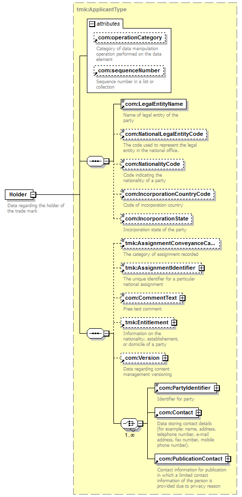 com:LegalEntityName com:NationalLegalEntityCode com:NationalityCode com:IncorporationCountryCode com:IncorporationState tmk:AssignmentConveyanceCategory tmk:AssignmentIdentifier com:CommentText tmk:Entitlement com:Version com:PartyIdentifier com:Contact com:PublicationContact |
