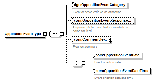 <xsd:choice minOccurs="0"> <xsd:element ref="com:OppositionEventDate"/> <xsd:element ref="com:OppositionEventDateTime"/> </xsd:choice> |