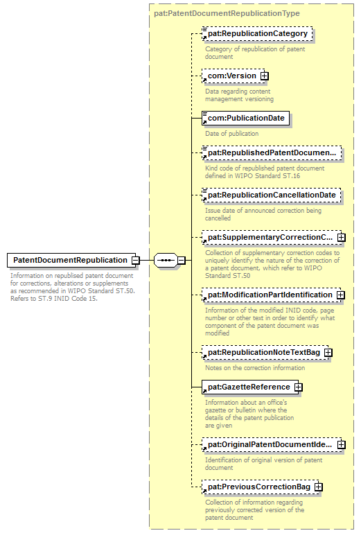 | children | pat:RepublicationCategory com:Version com:PublicationDate pat:RepublishedPatentDocumentKindCode pat:RepublicationCancellationDate pat:SupplementaryCorrectionCodeBag pat:ModificationPartIdentification pat:RepublicationNoteTextBag pat:GazetteReference pat:OriginalPatentDocumentIdentification pat:PreviousCorrectionBag | ||||
