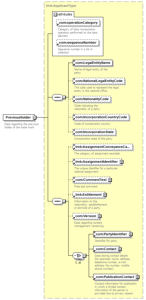 com:LegalEntityName com:NationalLegalEntityCode com:NationalityCode com:IncorporationCountryCode com:IncorporationState tmk:AssignmentConveyanceCategory tmk:AssignmentIdentifier com:CommentText tmk:Entitlement com:Version com:PartyIdentifier com:Contact com:PublicationContact |
