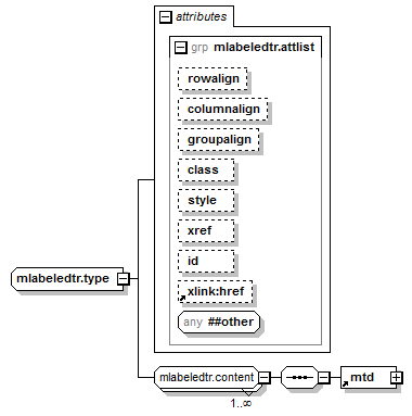 | source | <xsd:complexType name="mlabeledtr.type"> <xsd:group ref="mlabeledtr.content" minOccurs="1" maxOccurs="unbounded"/> <xsd:attributeGroup ref="mlabeledtr.attlist"/> </xsd:complexType> |