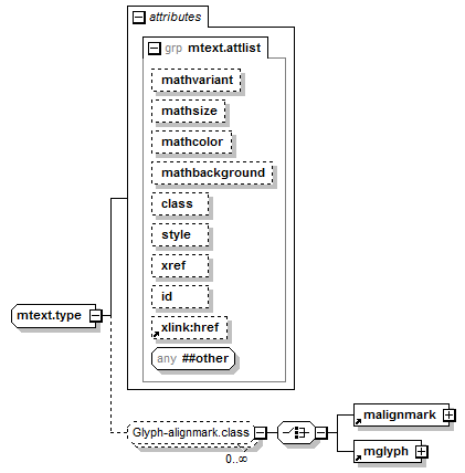 | source | <xsd:complexType name="mtext.type" mixed="true"> <xsd:group ref="Glyph-alignmark.class" minOccurs="0" maxOccurs="unbounded"/> <xsd:attributeGroup ref="mtext.attlist"/> </xsd:complexType> |
