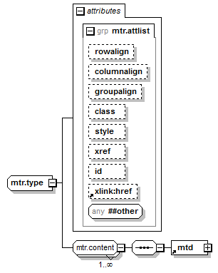 | source | <xsd:complexType name="mtr.type"> <xsd:group ref="mtr.content" minOccurs="1" maxOccurs="unbounded"/> <xsd:attributeGroup ref="mtr.attlist"/> </xsd:complexType> |