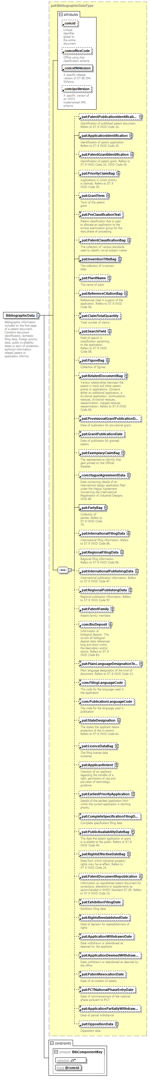 <xsd:documentation>Bibliographic information included on the first page of a patent document. Contains document identification, domestic filing data, foreign priority data, public availability dates or term of protection, technical information, related patent or application informa