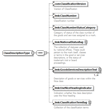 | children | com:ClassificationVersion tmk:ClassNumber tmk:ClassNumberStatusCategory tmk:NationalStatusBag tmk:GoodsServicesDescriptionText tmk:UseNiceHeadingIndicator tmk:ClassificationTermBag | ||||
