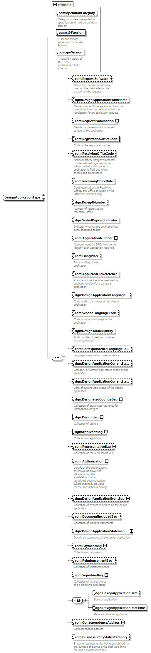 | children | com:RequestSoftware dgn:DesignApplicationFormName com:RequestExamination com:RegistrationOfficeCode com:ReceivingOfficeCode com:ReceivingOfficeDate dgn:ReceiptNumber dgn:SealedDepositIndicator com:ApplicationNumber com:FilingPlace com:ApplicantFileReference dgn:DesignApplicationLanguageCode com:SecondLanguageCode dgn:DesignTotalQuantity com:CorrespondenceLanguageCode dgn:DesignApplicationCurrentStatusCategory dgn:DesignApplicationCurrentStatusDate dgn:DesignatedCountryBag dgn:DesignBag dgn:ApplicantBag com:RepresentativeBag com:Authorization dgn:DesignApplicationEventBag com:DocumentIncludedBag dgn:DesignApplicationStatementBag com:PaymentBag com:ReimbursementBag com:SignatureBag dgn:DesignApplicationDate dgn:DesignApplicationDateTime com:CorrespondenceAddress com:BusinessEntityStatusCategory | ||||||||||||||||||||||||||||||||||||||||||||